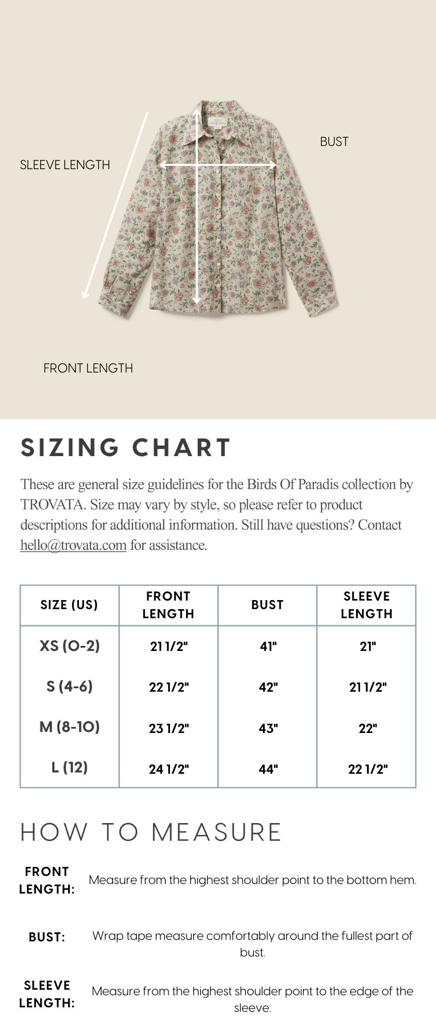Introducing a new take on our Grace Classic Shirt, the Jacquelin Shirt. This shirt fits true to size, has a clean front, and a slightly exaggerated collar. Shown here in Alegria Bloom. Made from our cotton.