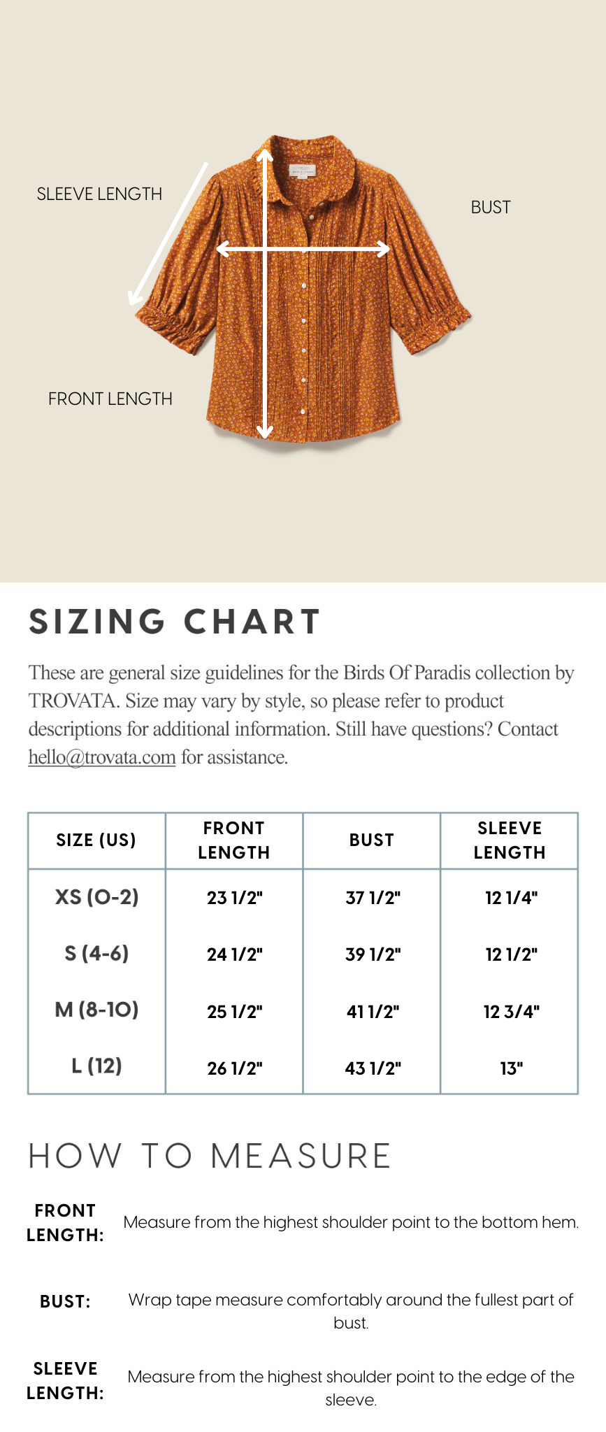 Our Gemma blouse is new this season it has a ruffled collar and matching sleeve detail. The pintuck detailing down the front body, and easy going elbow-length sleeves. The slim body makes for an easy to wear untucked or tucked look. Finished with our pearl white buttons. Shown here in Bellflower Ditsy. Made from our cotton silk.