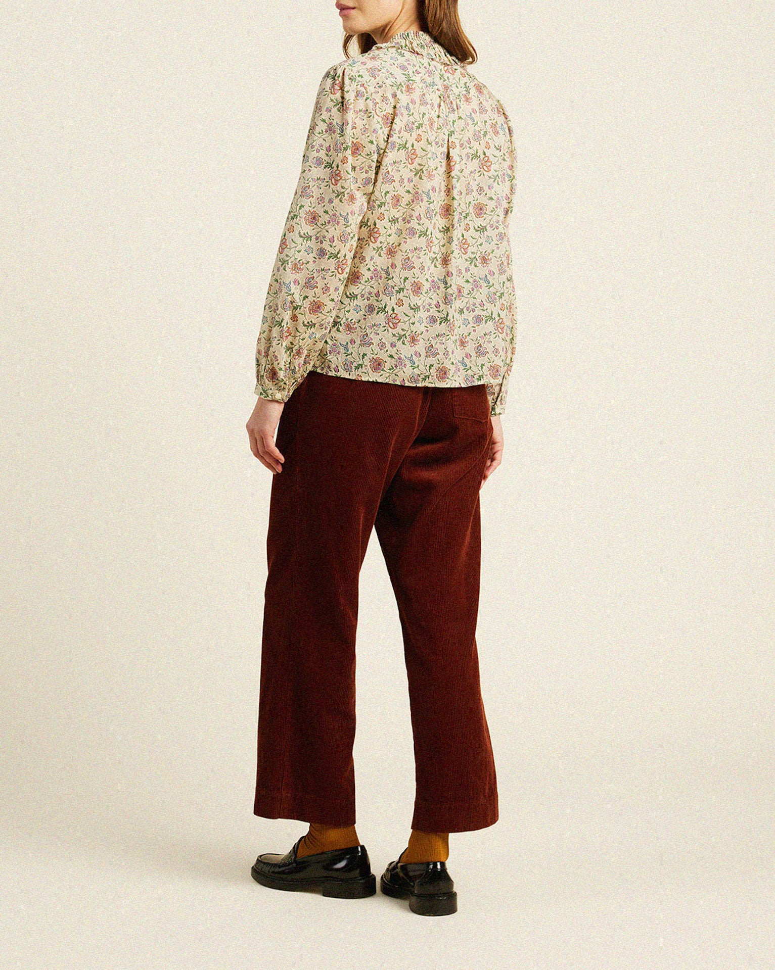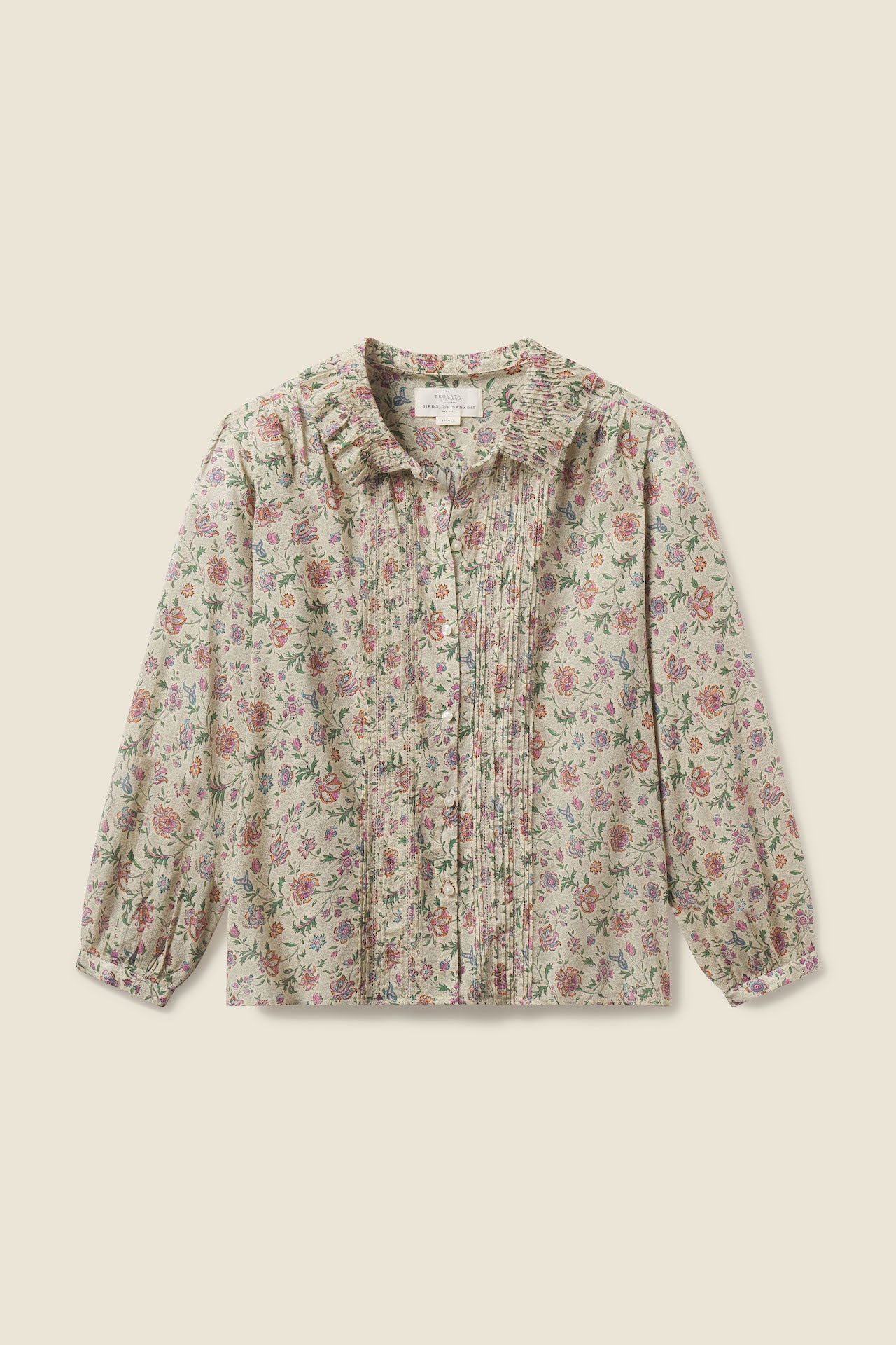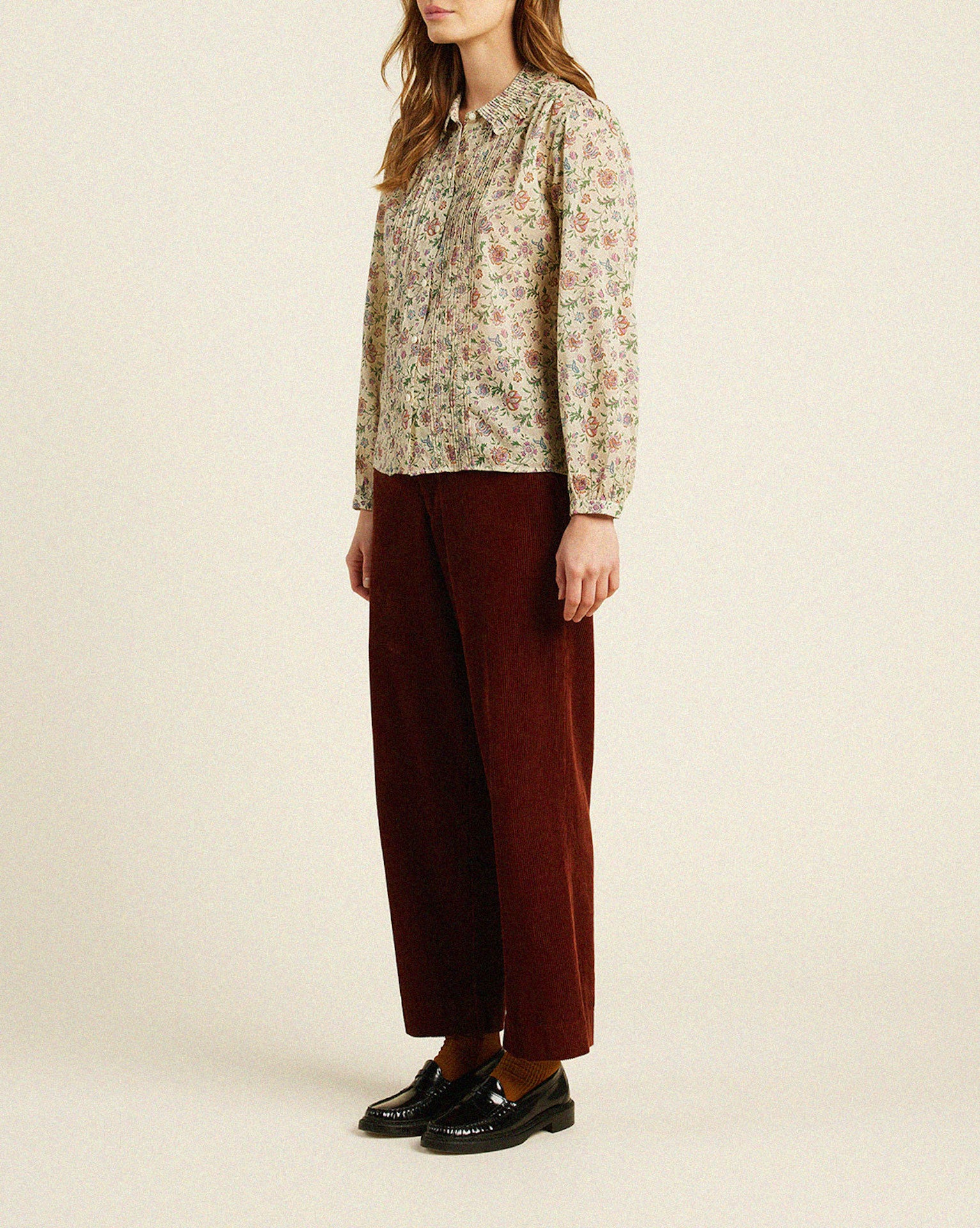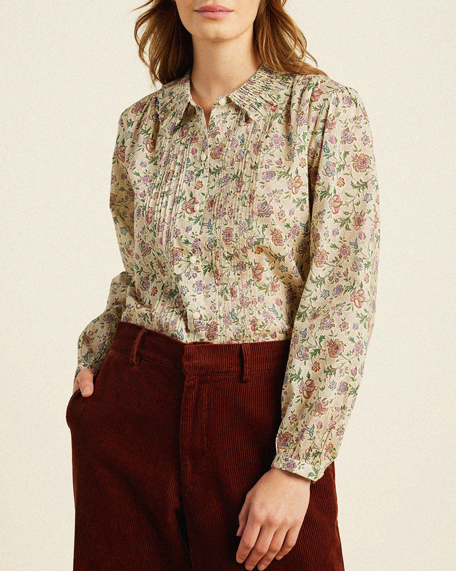 The Alise Blouse features variegated pintucking that delicately borders a front buttoned placket. Additional pintucks encircling the neck release into a gently ruffled bib collar, perfect for layering with a light sweater. Whether paired with tailored trousers for a professional setting or dressed down with jeans for a casual look, this blouse exudes personality and timeless elegance. Shown here in Herbarium Print and made from our Cotton.