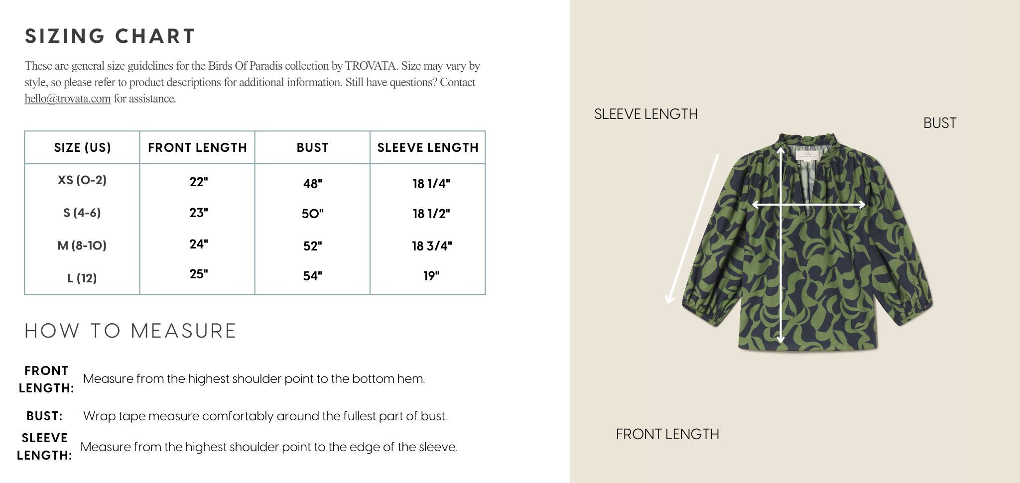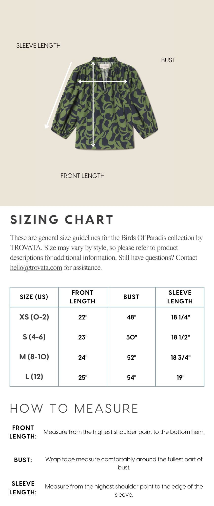 The Orly Blouse is a slightly cropped, billowy blouse with straight bottom hem, split v-neckline and buttoned crown collar. Gathered three-quarter length sleeves finished with delicate bindings. Includes our signature back detail with a gathered waist tab. Shown here in Muted Canopy and made from our cotton viscose.