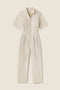 The Audra Jumpsuit showcases front waist pleats, a buttoned placket and cleanly finished waistband with discreet side elastic for adjustability. Featuring a classic collar, chest pockets, straight short sleeves, and ankle-length straight-leg pants, it combines tailored visual details with comfortable fit. Shown here in Ivory Twill and made from our soft cotton twill.