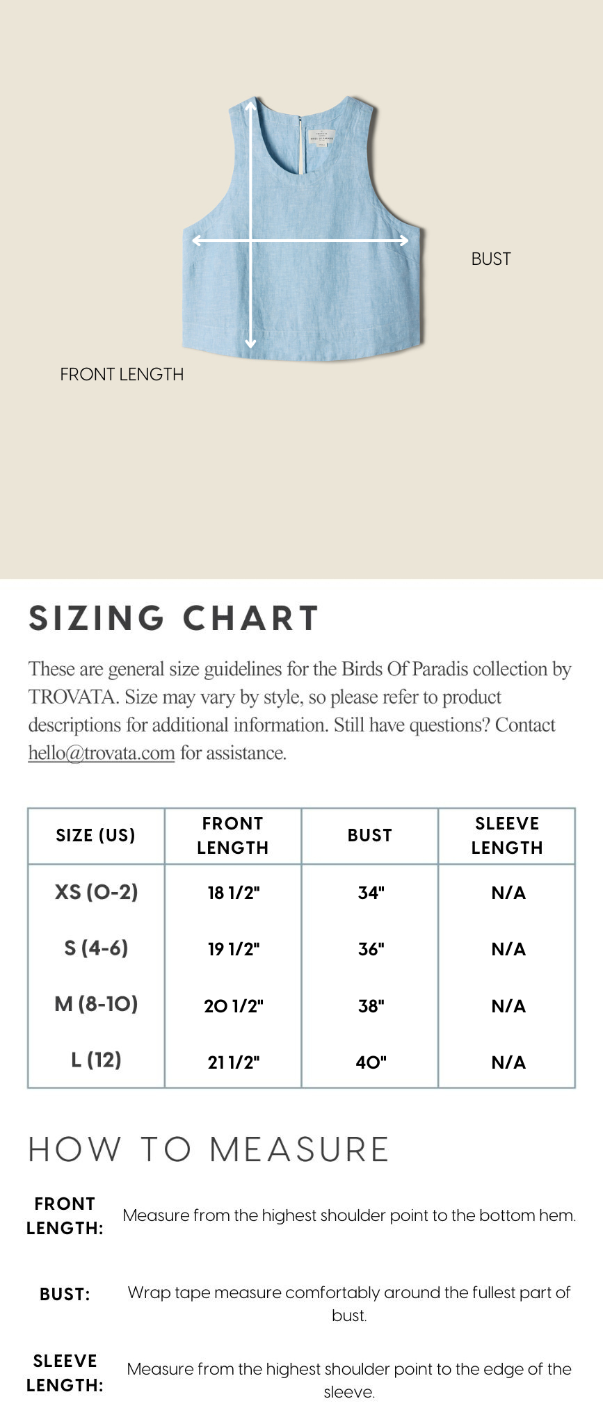 The Esther is our new summer tank. Slightly cropped with a rounded neckline and buttoned back closure, designed for warm summer weather in our custom lightweight Trovata linens. Modern yet classic with cleanly finished hems, bust darts, and seamless throughout. A streamlined silhouette on its own or part of a softly structured linen set. Designed to be worn with matching Everett Short, Leigh Trouser Pant or loose jeans for a relaxed, polished look. Shown here in Sky Linen and made from our custom Trovata linen.