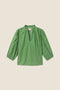 The Orly Blouse is a slightly cropped, billowy blouse with straight bottom hem, split v-neckline and buttoned crown collar. Gathered three-quarter length sleeves finished with delicate bindings. Includes our signature back detail with a gathered waist tab. Shown here in Green Medallion and made from our soft cotton poplin.